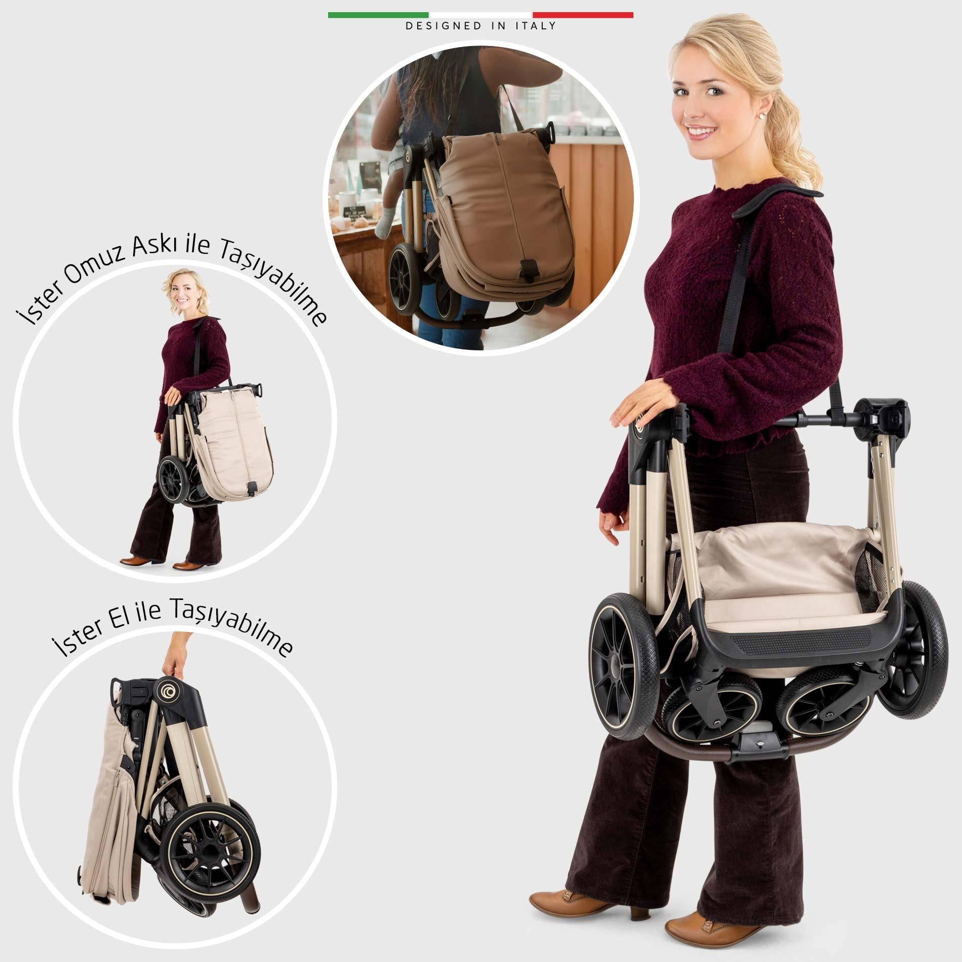 • Taşıma kemeri sayesinde bebek arabası katlandığında çanta şeklinde omuzda taşıyabilme kolaylığı sağlar.