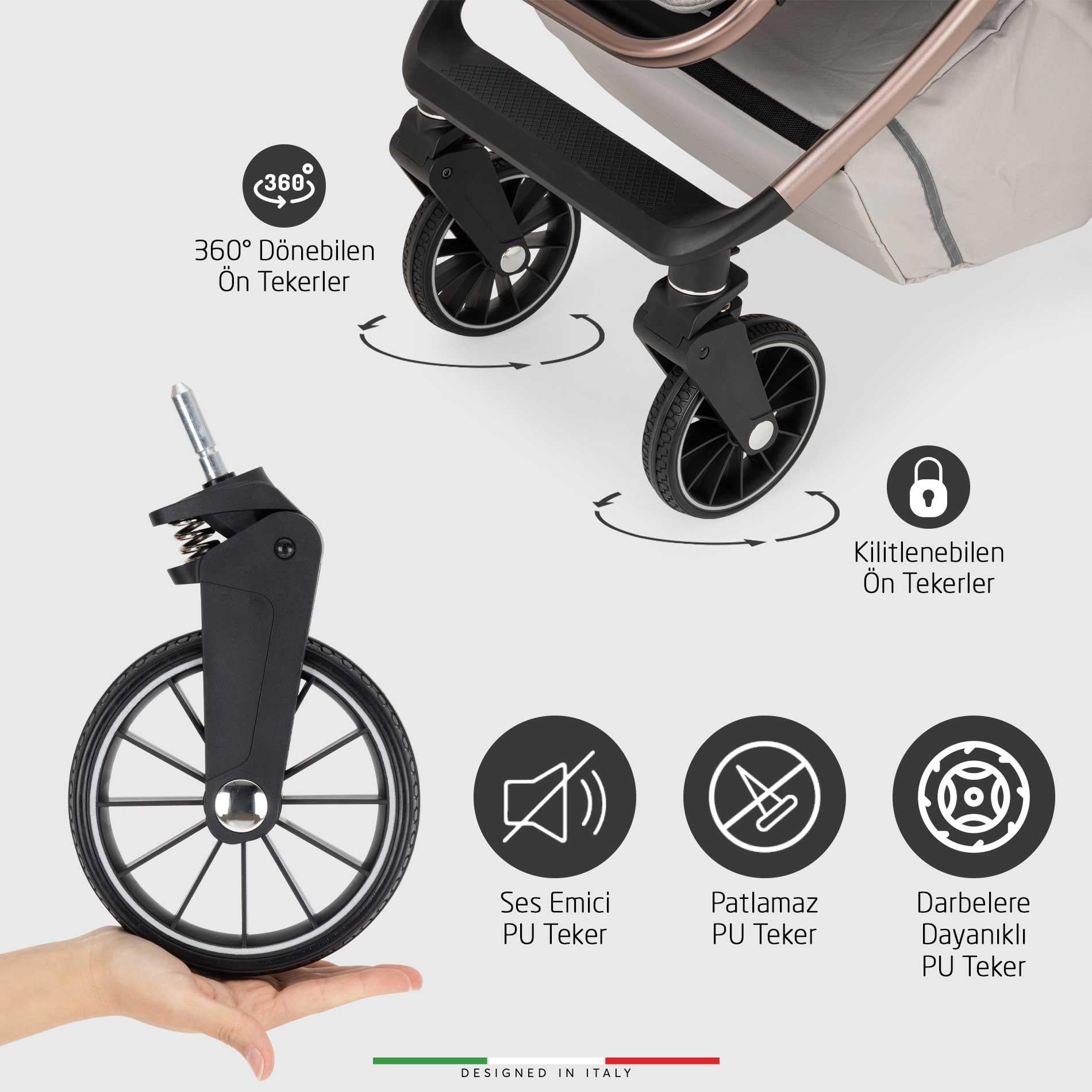 Milazzo Premium Çift Yönlü Bebek Arabası, bebeğinizin doğumdan itibaren tüm ihtiyaçlarını karşılar: