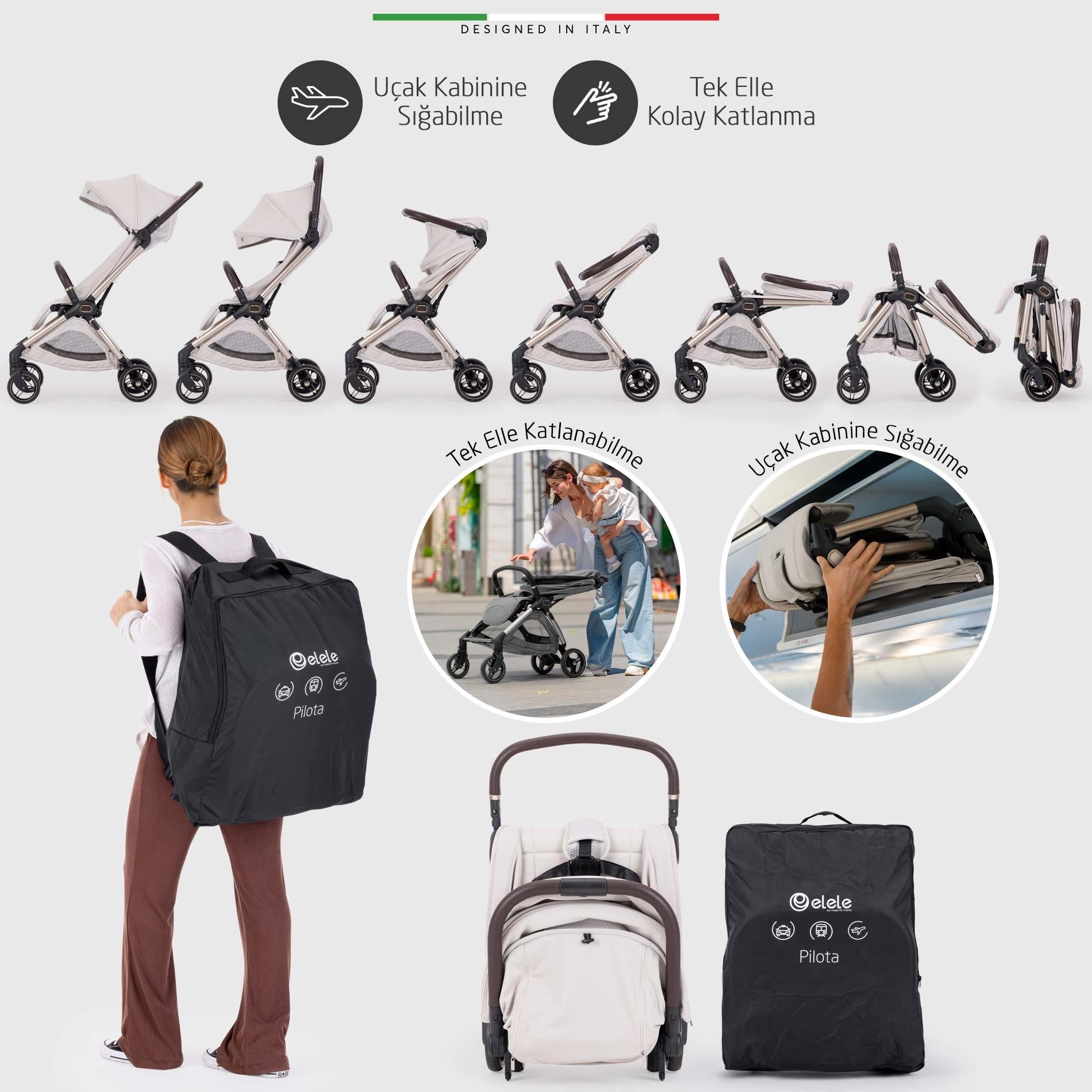 Elele Pilota Kabin Travel Bebek Arabası, sadece pratik değil aynı zamanda taşımayı da kolaylaştırıyor! Katlandığında kompakt hale gelen yapısı, özel tasarım sırt taşıma çantası ile birleşerek ebeveynlere maksimum hareket özgürlüğü sağlar. Uçakta, merdivende veya şehir gezilerinde Pilota her zaman kolay taşınır, her yere sığar!