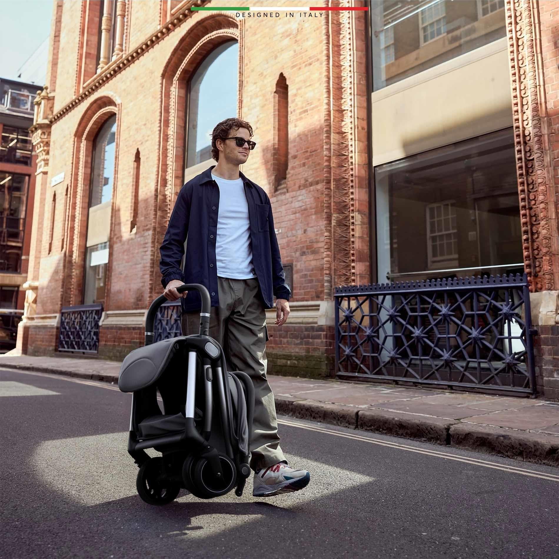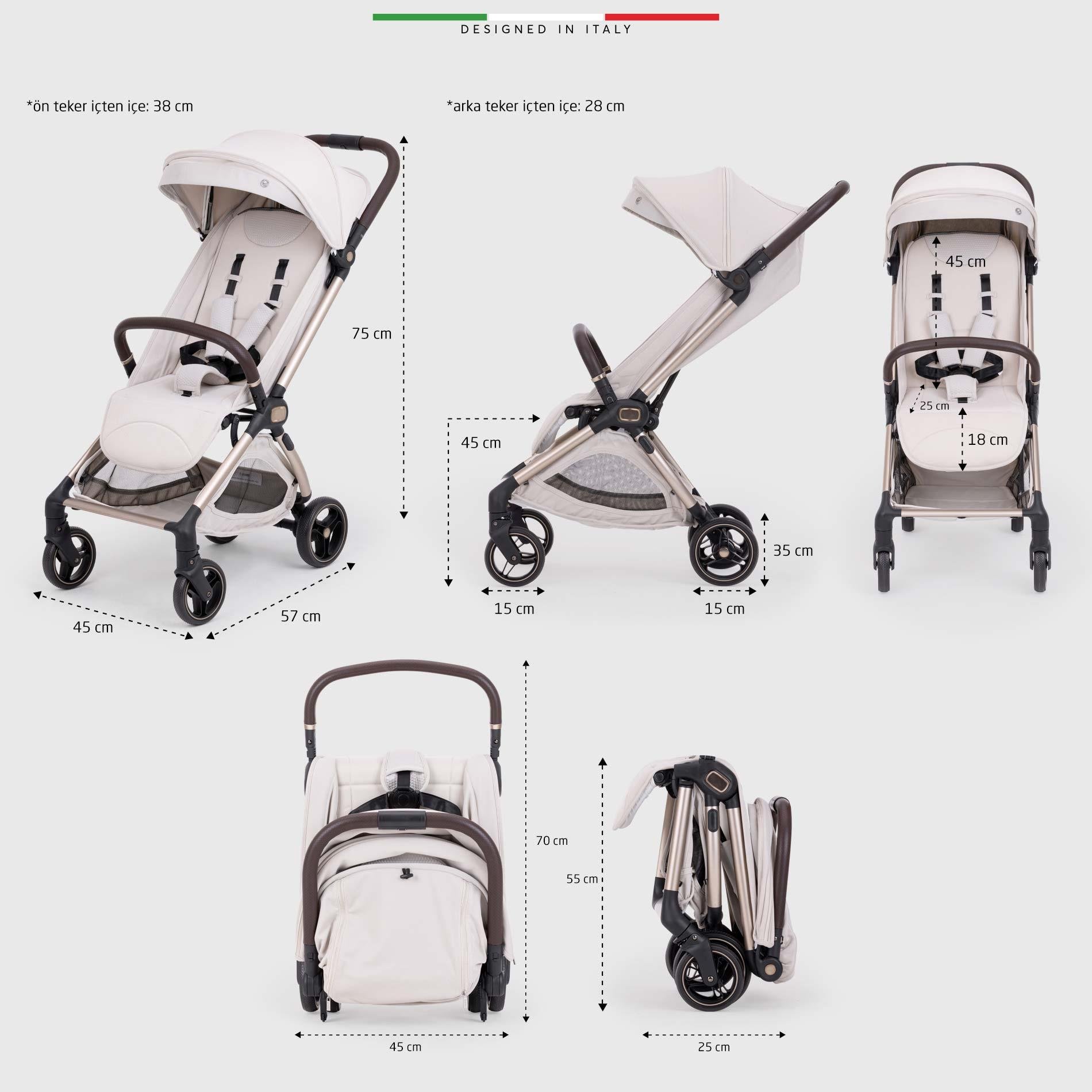 Tek elle katlanabilen mekanizması sayesinde arabayı saniyeler içinde küçültürsünüz. Katlandıktan sonra sırt çantasına kolayca yerleştirilebilir — uçak kabinlerine, araç bagajına ya da dolaplara rahatça sığar.