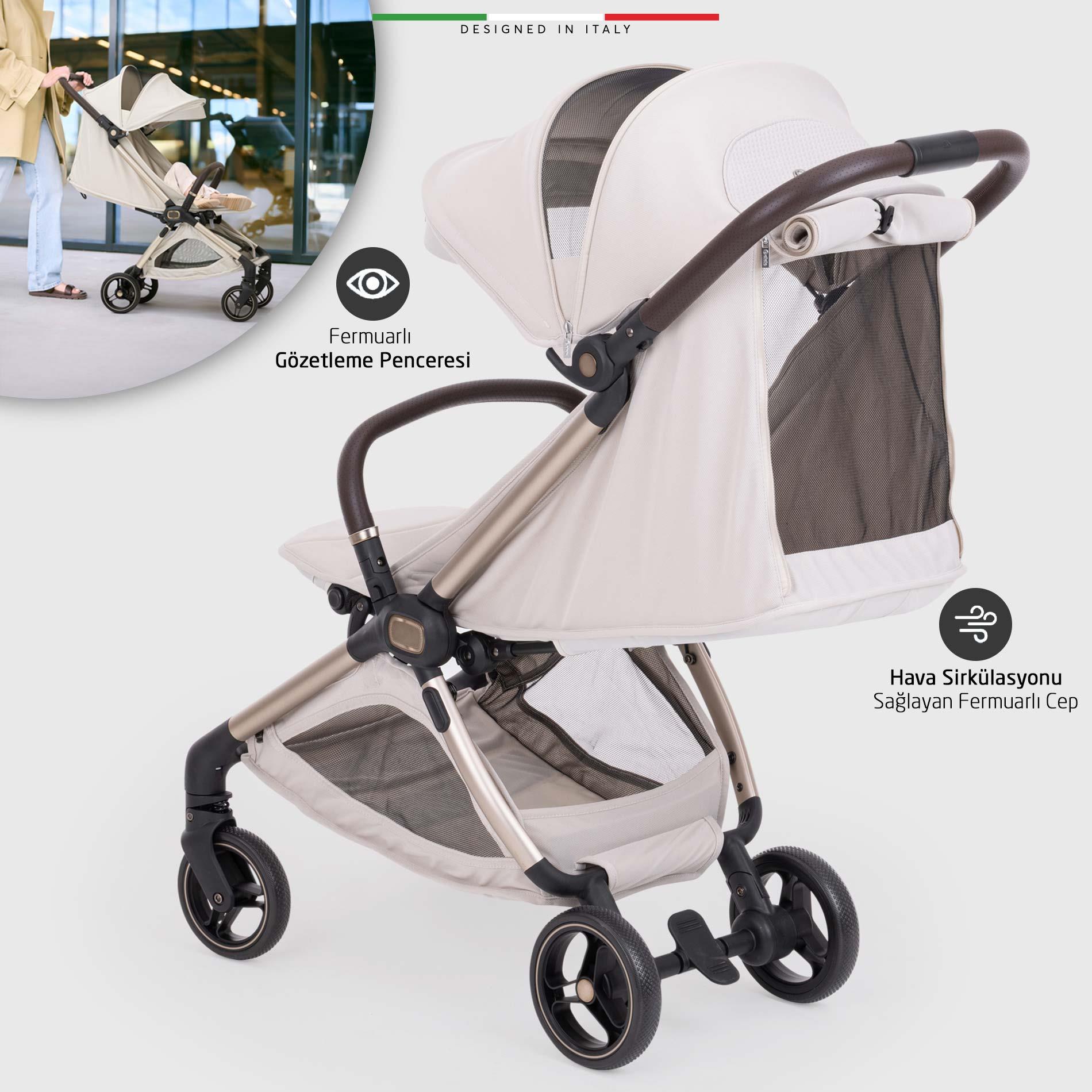 Bebek arabası özel taşıma çantası sayesinde sırt çantası gibi kolayca taşınabilir. Elleri serbest bırakan bu tasarım, özellikle seyahatlerde, merdivenlerde veya toplu taşıma araçlarında maksimum rahatlık sunar.