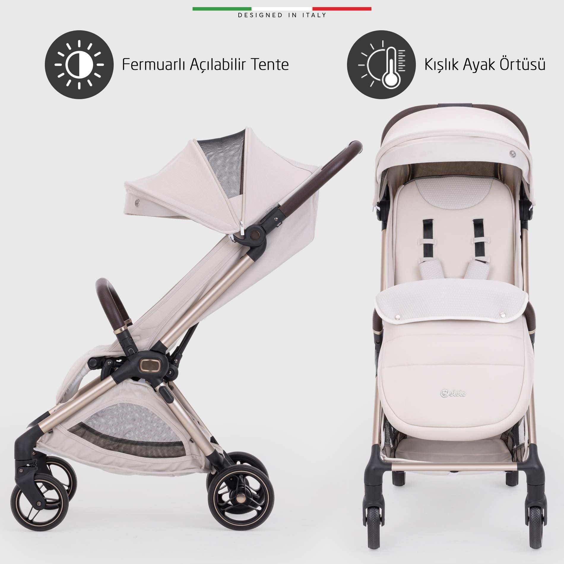 Elele Pilota Kabin Travel Bebek Arabası, dört mevsim kullanım konforu sunan detaylarıyla ebeveynlerin vazgeçilmezi! Fermuarlı açılabilir tente ile yazın ferahlık, kışlık ayak örtüsü ile soğuk havalarda sıcaklık sağlar. Kompakt tasarımı, pratik kullanımı ve zarif detaylarıyla hem şehir içinde hem seyahatlerde mükemmel bir yol arkadaşıdır.