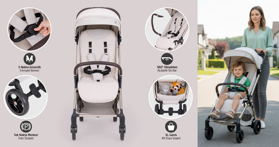 Sadece tek bir el hareketiyle otomatik olarak katlanır. Ebeveynler için maksimum kolaylık ve hız sağlar — özellikle seyahat sırasında eliniz doluyken büyük avantaj!