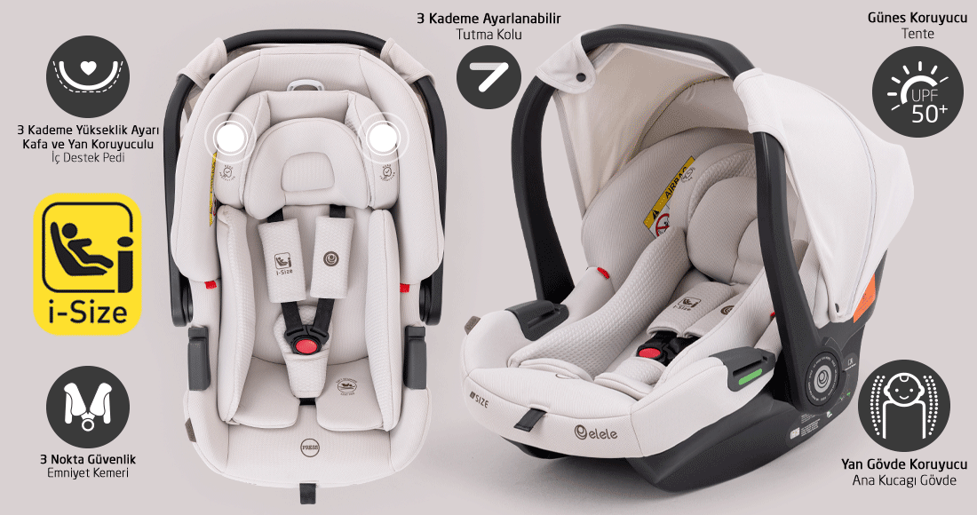 Elele Pilota i-Size oto koltuğu, UN R129 (i-Size) güvenlik standardına uygun yapısıyla bebeğiniz için en yüksek koruma düzeyini sunar. Üç kademeli yükseklik ayarı, yan darbe koruma sistemi ve UPF 50+ güneş korumalı tentesiyle hem güvenli hem konforlu bir yolculuk sağlar. Yumuşak iç destek pedleri ve ergonomik yapısı sayesinde yenidoğan 13 kg’a kadar kullanım imkânı sunar.