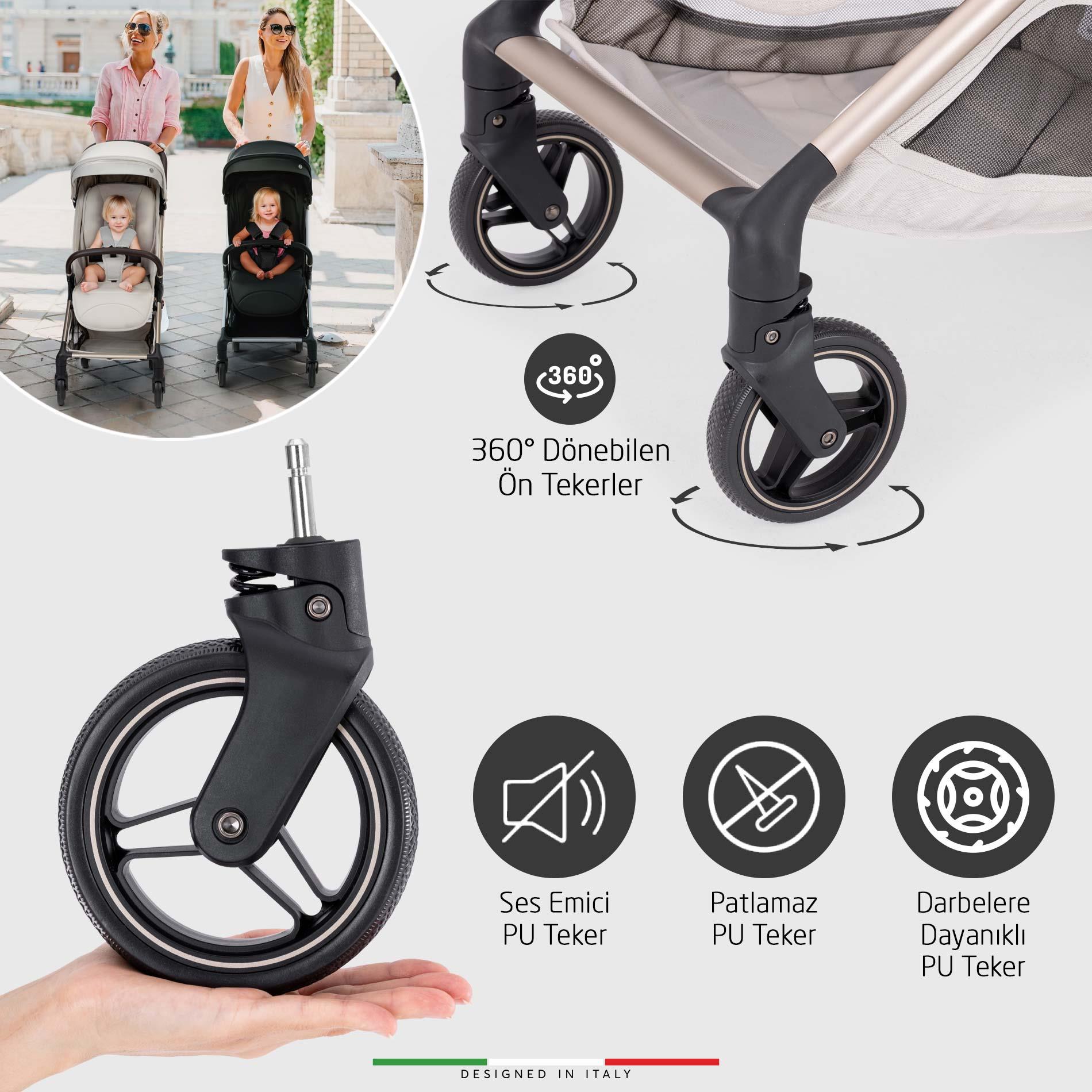 Açılabilen küçük tekerlekleri sayesinde bebek arabası katlı pozisyonda dahi rahatça sürülebilir. Taşımak yerine çekerek ilerletme imkânı sağlar — pratik, ergonomik ve zahmetsiz!