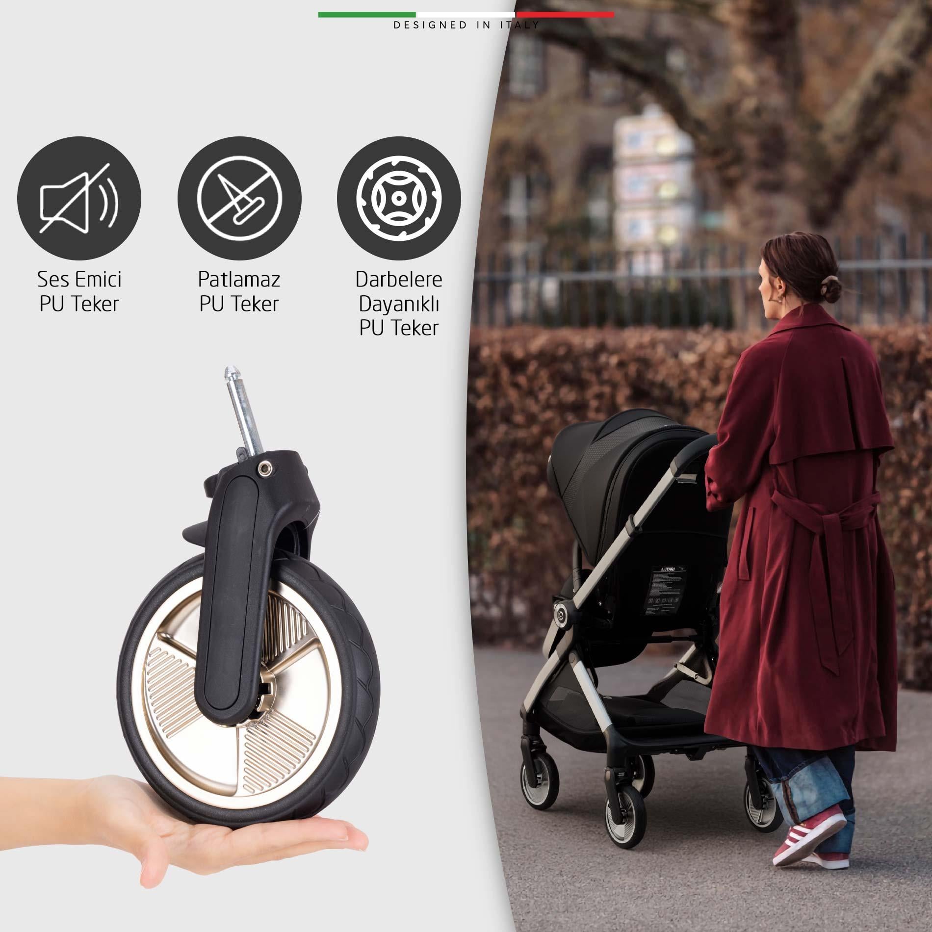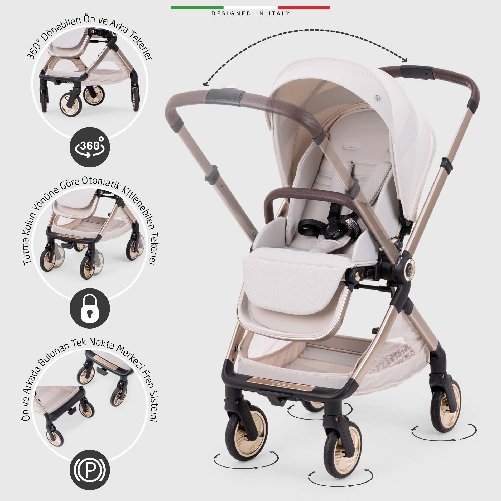 Rotabile Premium, 5 nokta emniyet kemerinden 360° dönebilen ön barına, geniş alt sepetinden tek nokta fren sistemine kadar hem ebeveyn hem de bebeğin konforunu artıran akıllı detaylarla donatılmıştır.