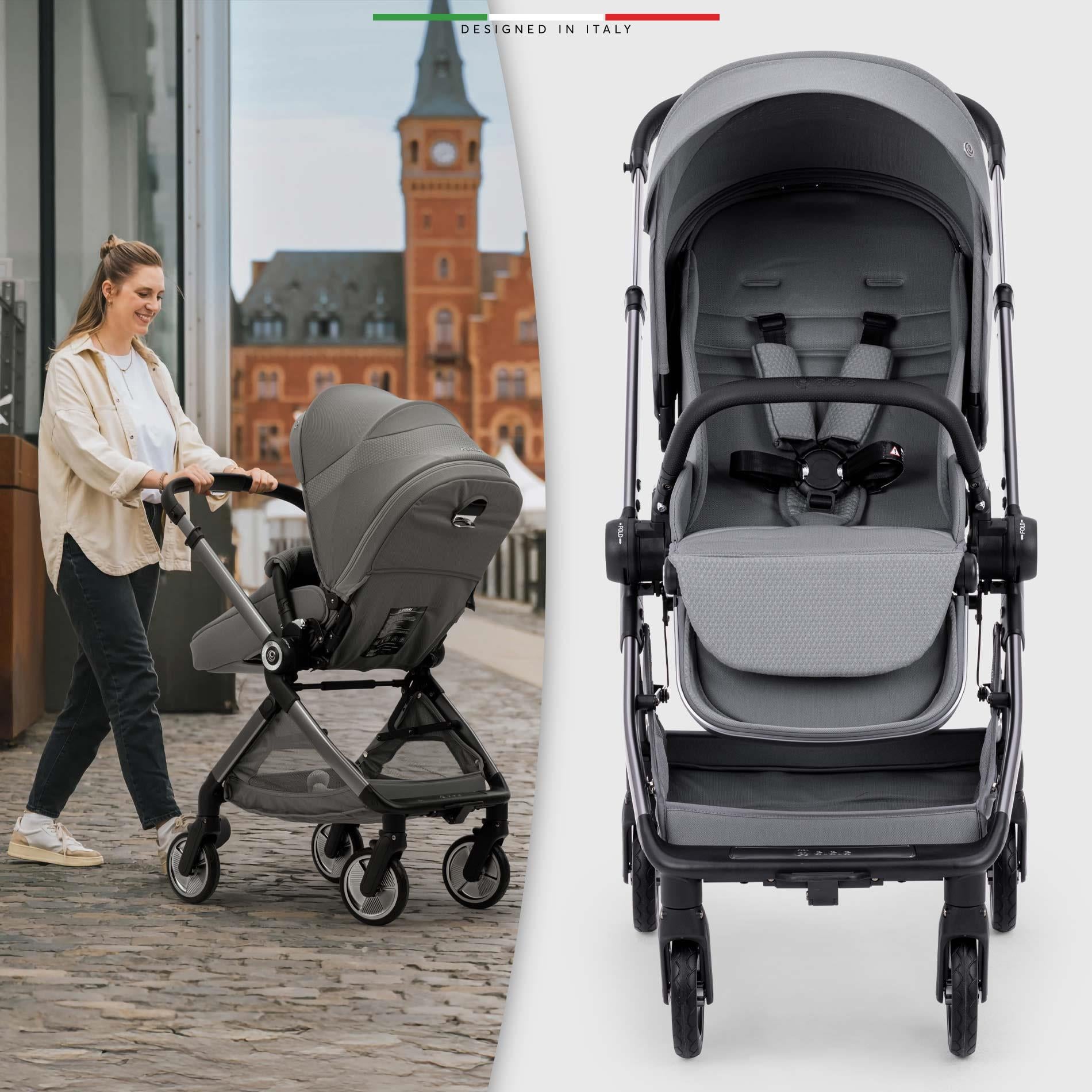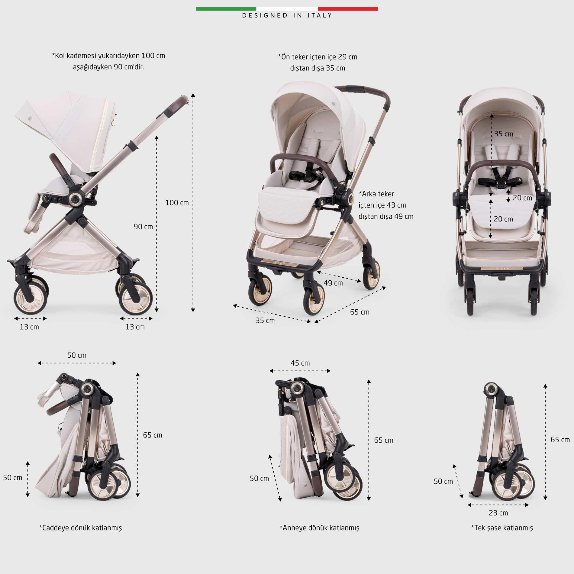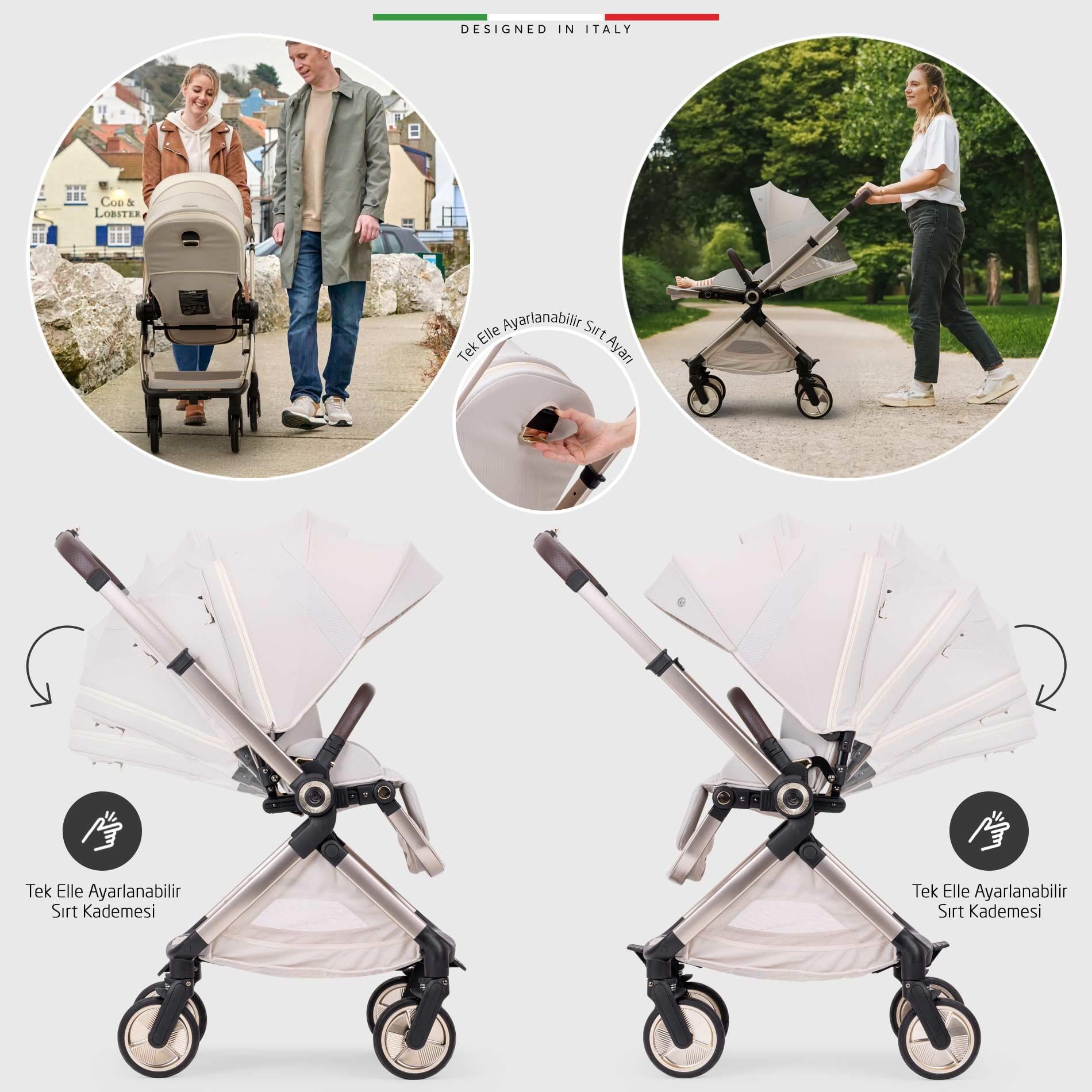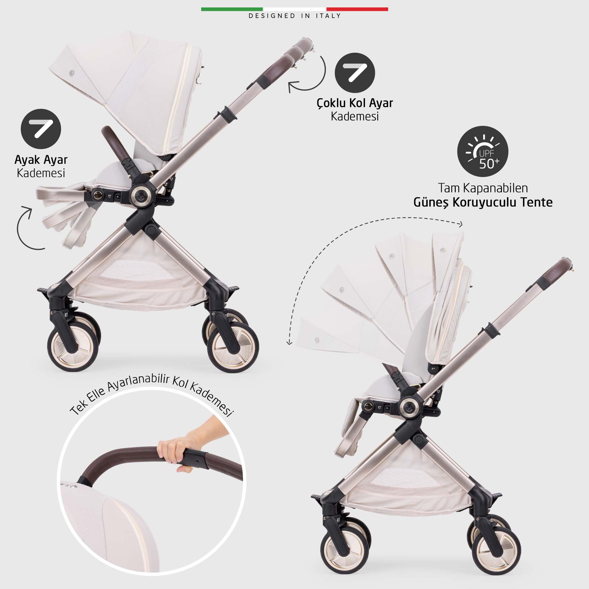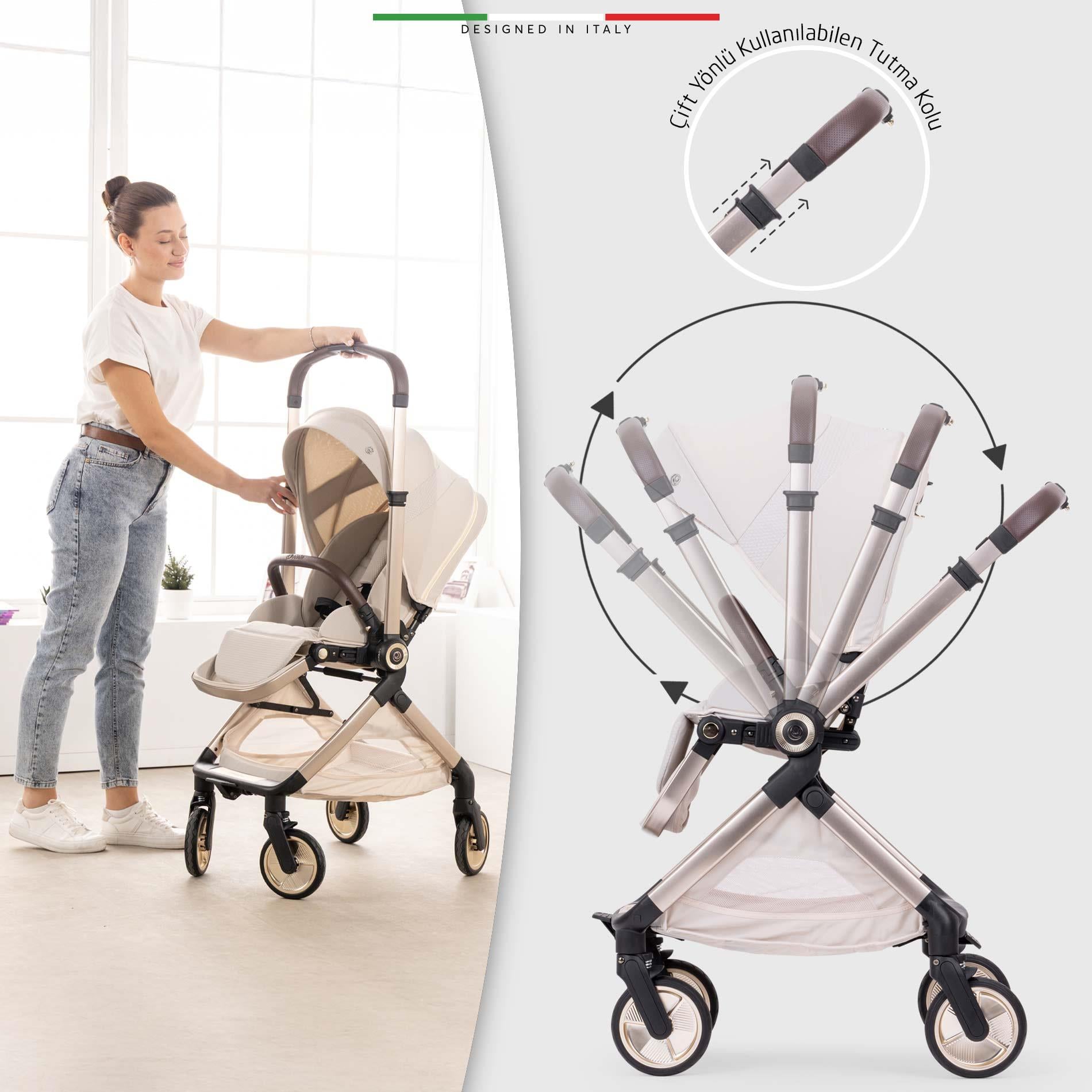 Elele Rotabile Bebek Arabası, sadece oturma ünitesinde değil, itme kolunda da çift yönlü kullanım imkânı sunar. Ebeveyn, arabayı ister önden ister arkadan yönlendirebilir; böylece hem bebeğin konumuna hem kullanım alışkanlığına göre en konforlu sürüş sağlanır. Yön değiştirmek sadece saniyeler sürer — Rotabile, pratikliği premium seviyeye taşır.