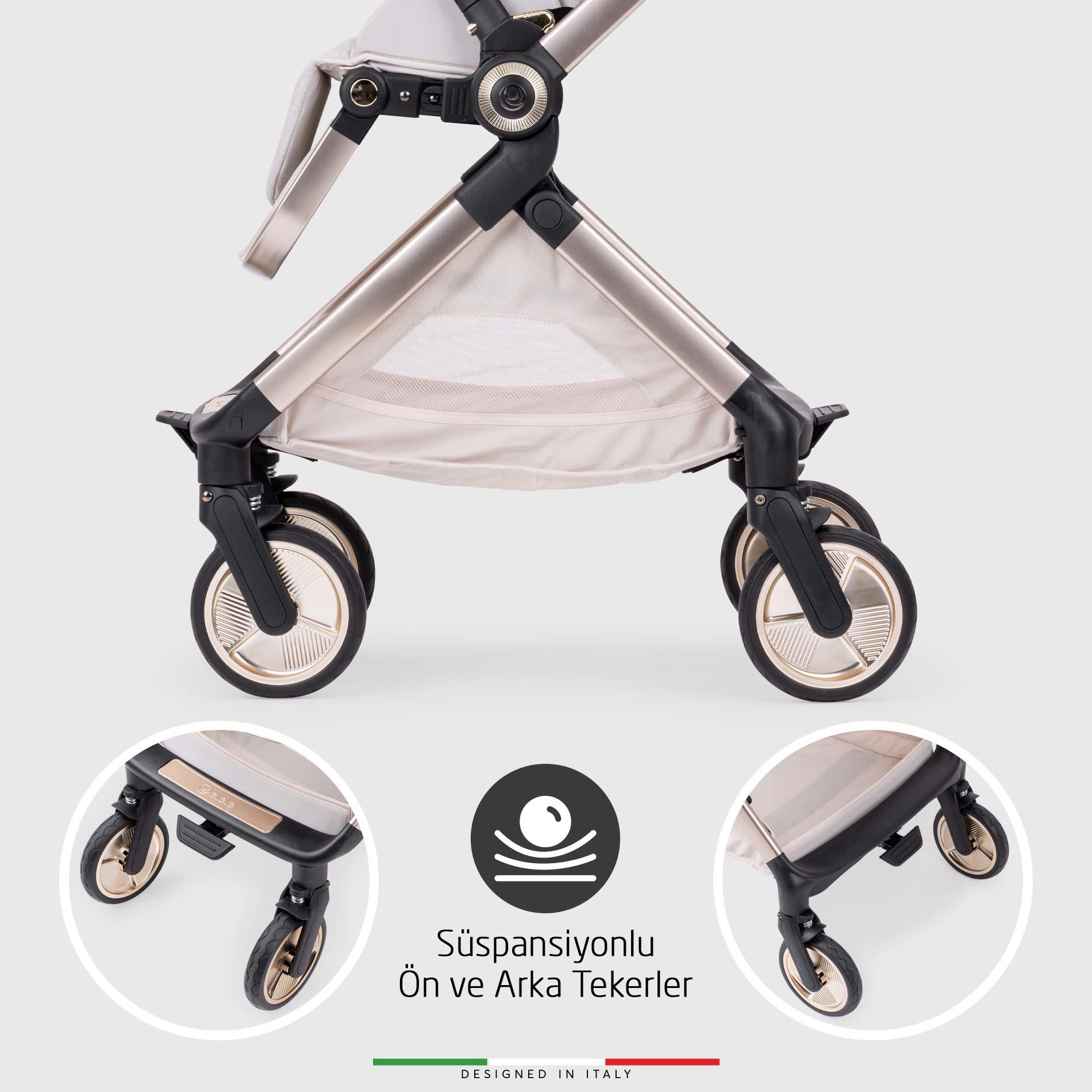 • Bebeğin konforunu bozmadan engebeli yollarda bile düzgün sürüş sunar.