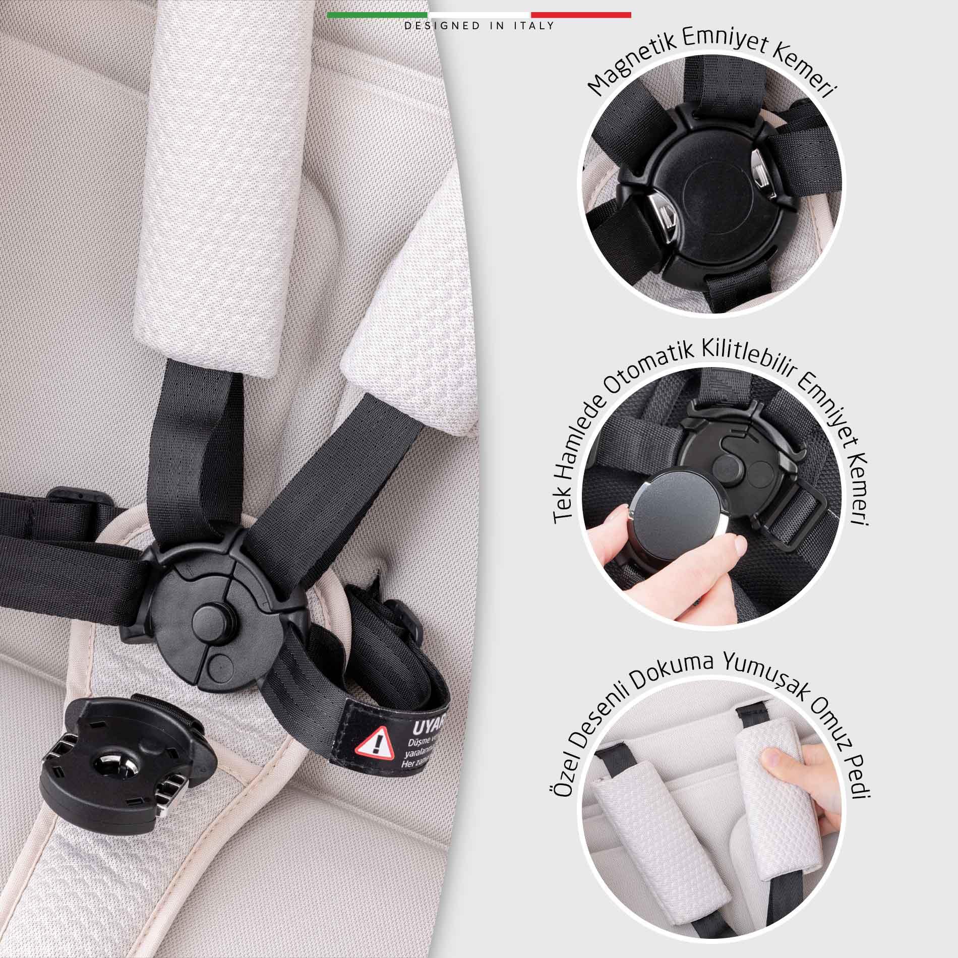 • Bebeğin omuz, bel ve bacak bölgesini güvenle sabitleyen 5 nokta kemer sistemi, hareket sırasında maksimum güvenlik sağlar.