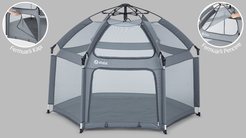 Dış mekân ve ev kullanımında bebeğiniz için güvenli, havadar ve kolay erişilebilir bir alan. Fermuarlı kapı ve fermuarlı üst pencere sayesinde hem ebeveyn müdahalesi pratikleşir hem de hava sirkülasyonu artar.