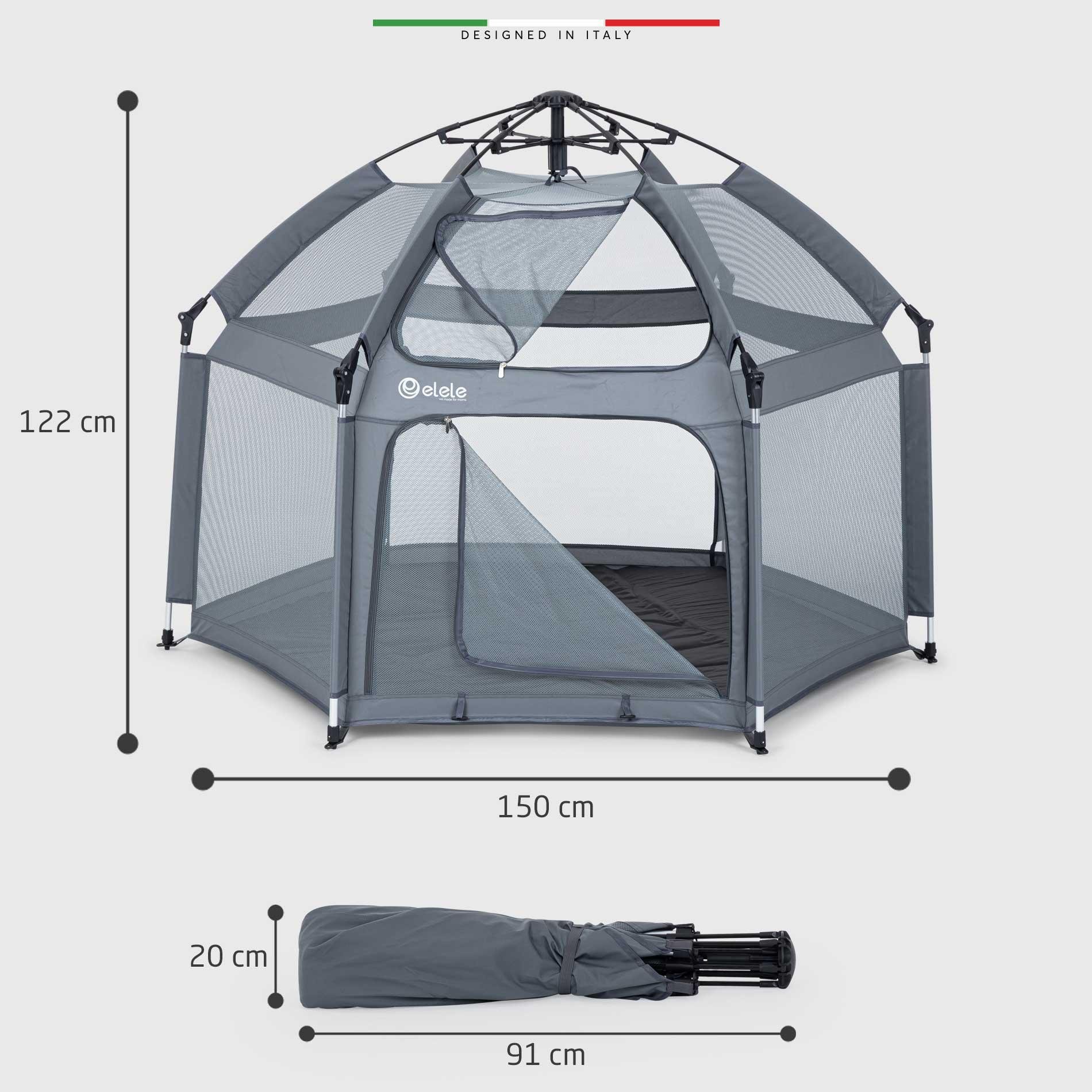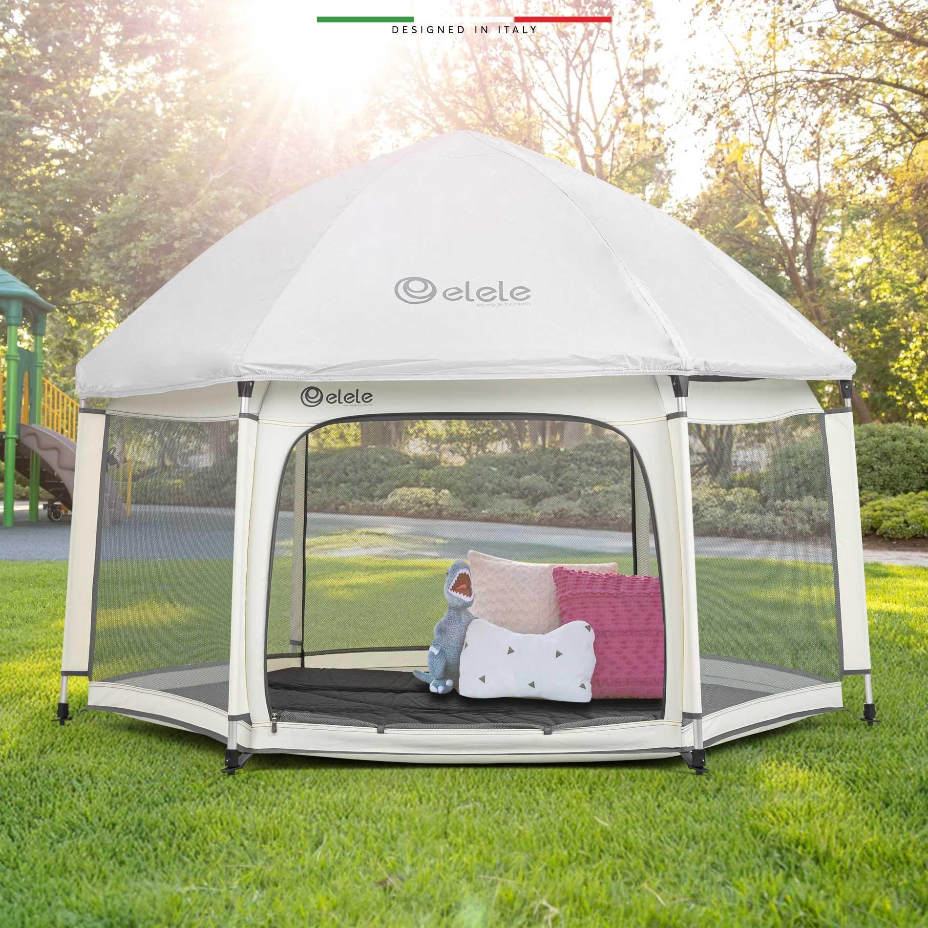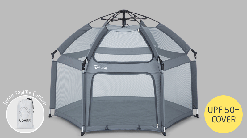Bebeğiniz için gölgeli, serin ve nefes alan bir oyun alanı: UPF 50+ tente, tek parça yapısı ve taşıma çantasıyla dış mekânda maksimum pratiklik sunar.